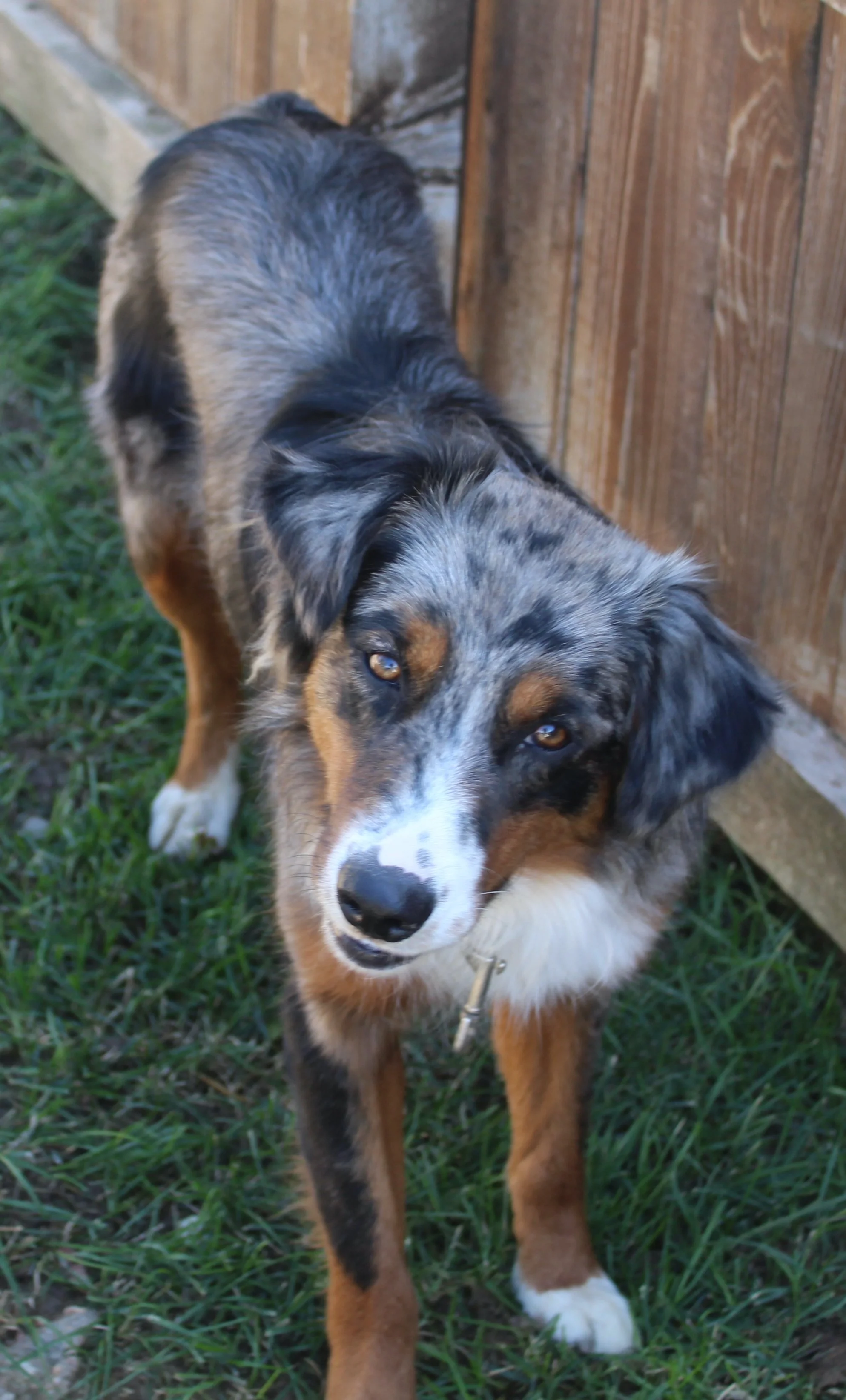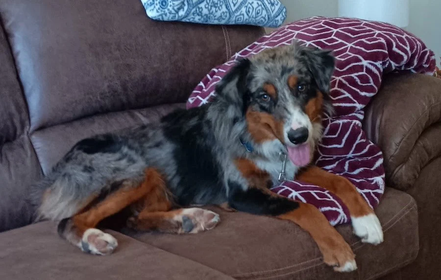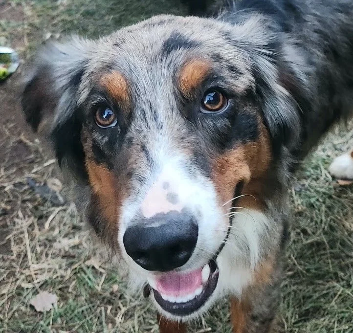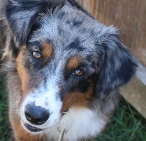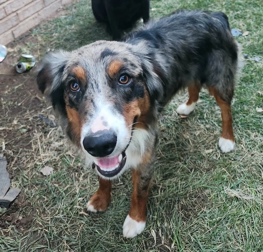Blue is an male Aussie, 1 year old and about 45 pounds.