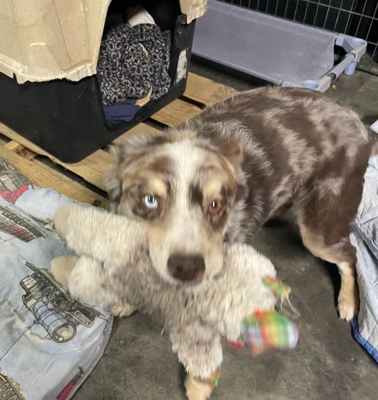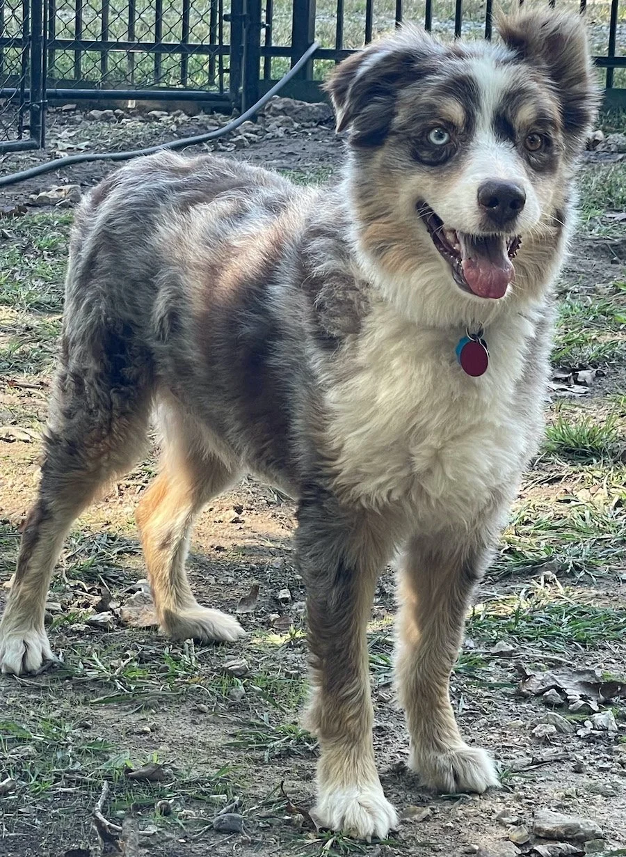 He is 3 years old and 50 pounds. When he was found he was filthy and so matted he had to be shaved. Fortunately his beautiful blue merle coat is growing back.